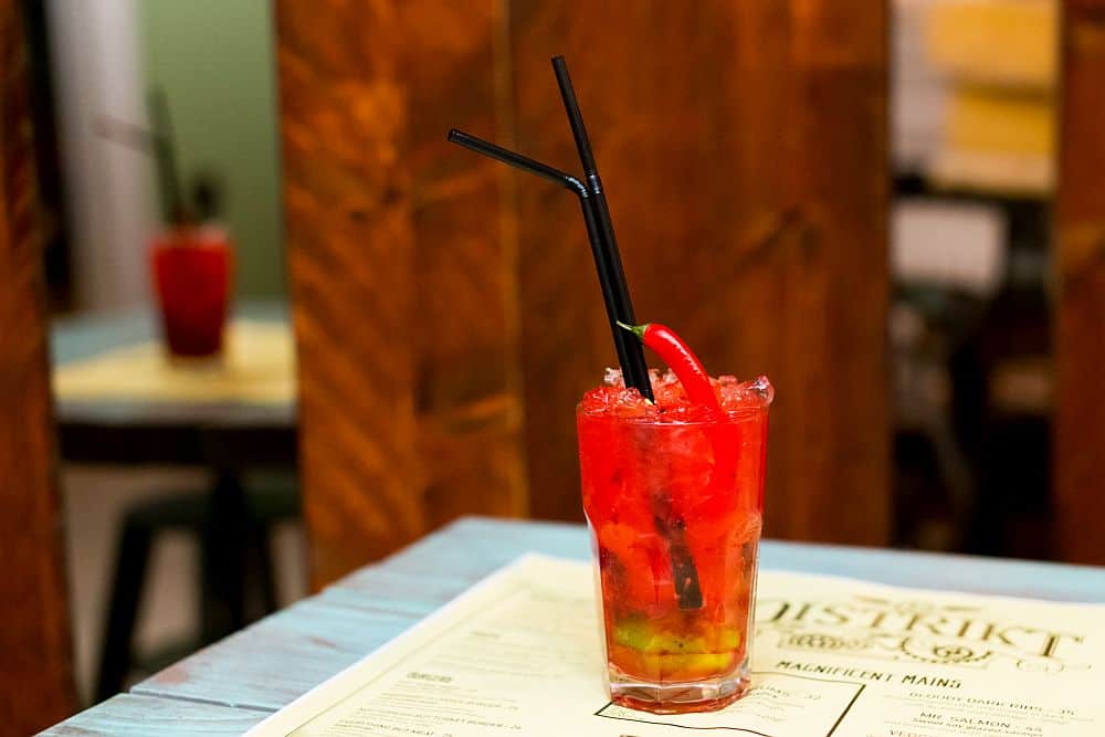 Mâncarea și băutura se încadrează perfect în stilul designului iar Distrikt 42 vine și aici cu noutăți și abordări diferite. De exemplu, obișnuiții mici sunt un “deliciu devenit capriciu” – mici pe baghetă, cu vlăstari de muștar și însoțiți de o porție de cartofi prăjiți. De la secțiunea de “delicii de pub”, la “parte-împarte” și până la specialitățile chefului, pe care le poți găsi în secțiunea “din culisele șefului”, abordările sunt surprinzătoare. Fiecare preparat special a primit o denumire interesantă: “Distrikt Nachos Grande”, “Sus, tot mai sus” (aripioare crocante de pui), “De toate pentru toți”, “Cremă de dovleac ușor pișcătoare” și altele.