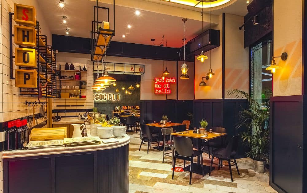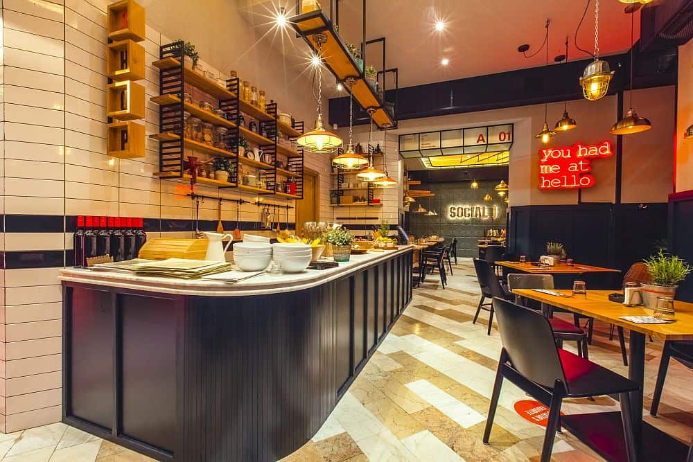 Conceptul Social 1 pornește de la un decor amuzant, bogat în elemente de design inspirate din “cultura frumosului” cultivat înainte de 1989, păstrate din vechea structură arhitectonică a clădirii în care se află. Studioul de arhitectură PickTwo, a cărui semnătură se regăsește si la Stadio, reinterpretează ironic valori din “România socialistă” folosind însă limbajul comod al localurilor londoneze. Zona de bar jos este concepută pentru a se putea aduna lumea, și chiar a se așeza pe el, în timp ce stau pentru un aperitivo, ori seara, când ies la un drink. Tot aici se întâmplă și sesiunile de live cooking sau alte evenimente găzduite de restaurant.